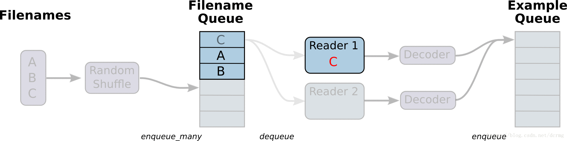 从文件读取数据的方式是在Graph图中定义好文件读取的方式,在Session会话中启动(一个或多个)线程,把训练数据异步加载到内存(样本)队列中(先加载到文件名队列中,tf自动读取到内存队列中),通过队列管理器进行管理,执行效率较高,工作流程示意图:1
