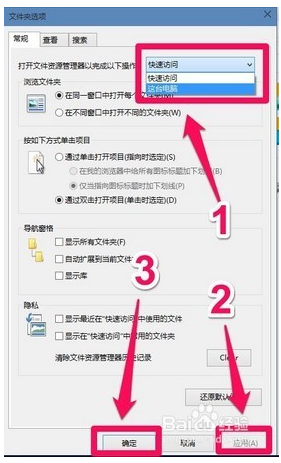 4.打开文件资源管理器以完成以下操作中选“这台电脑”,再点“应用”、“确定”即可