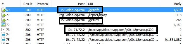 回到正题, 我们从浏览器输入链接http://v.qq.com/cover/g/g9jgclyhpp5sp7p.html?vid=g00118pmaso, 抓到了很多http包,我这里给出一部分的截图