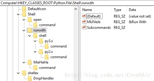 除了最内层两个 command 和 最外层的 runwith 其余的键都没有值。 runwith 里需要新建两个 字符串的值:一个命名为 MUIVerb,值为 &Run With,也就是这个菜单组的名称,注意要以 & 开头,这个字符不会被显示;第二个值,命名为Subcommands,没有值。如下图:
