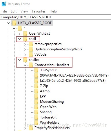 展开这一子项,在其内部,所有的右键菜单分为两部分存储(我也懒得去搞清楚这两块区域有什么不同),见下图: