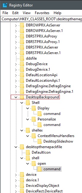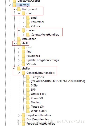然后是文件夹,文件夹分为两类菜单,一类是鼠标指向一个文件夹图标时,点击右键出来的菜单;第二类菜单时鼠标在已经打开的文件夹窗口的空白处,点击右键弹出的菜单。如下图所示,第一类菜单的注册表项直接在 Directory 下,shell和shellex\ContextMenuHandlers 里面;第二类菜单则在子项 Background 里面。