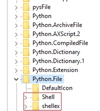 首先,还是找到包含python脚本文件的右键菜单项的注册表键,完整的路径是 Computer\HKEY_CLASSES_ROOT\pysFile ,如下图。这里可以看到,有3个子项。一眼可以看到右键菜单的藏身之处: