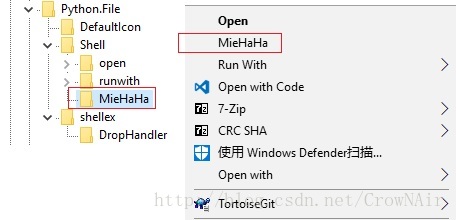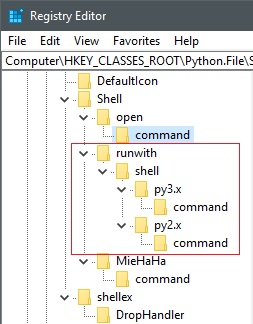有了这个菜单项,就能使用这一项直接用python运行脚本文件了。然而,这也太简陋了,看好多程序都用dll文件,把自己的菜单项折叠成了一个子菜单组,简洁又方便。在WIN10里,其实不用dll,只用注册表,也能自己制作一个折叠的子菜单组,比如上图(图8)的 Run With 项就是我自己写的一个菜单组。下图直接上键的树: