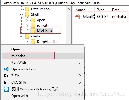 在新建的键里面(图里面的 MieHaHa键),再新建一个键,命名为 command,一般大小写都行,但是我还是建议全小写吧。然后更改这个键的默认值,双击(Default)(中文操作系统这里应该是默认),会弹出修改框,把值修改为你的python.exe所在完整路径+参数就可以了,比如我的python36安装在D:\Environment\Python36\python.exe, 那么我这里就要输入 "D:\Environment\Python36\python.exe" "%1" %*
