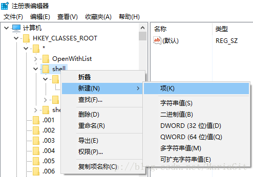运行后进入注册表界面:依次展开 HKEY_CLASSES_ROOT -> * -> shell,右键 shell 新建一个项并命名为:Open With Sublime Text 如图: