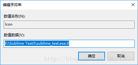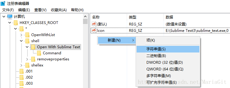 双击选中新建项 Open With Sublime Text ,在右边展示栏空白处右键新建字符串值,数值名称填 lcon ,数值数据填 E:\Sublime Text3\sublime_text.exe,0 (注意:路径请改成你安装Sublime Text 的路径喔)