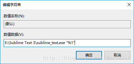 在“用Sublime Text打开”下再新建Command项,在右侧窗口的“默认”键值栏内输入Sublime Text程序所在的路径,在路径后添加 %1。%1表示要打开的文件参数。
