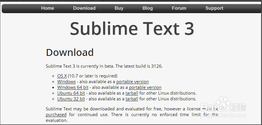 1.在Windows系统中,下载并安装sublime text3 软件,(可以到sublime text3 的官方网站下载),如下图,可以按不同的系统选择下载安装包。