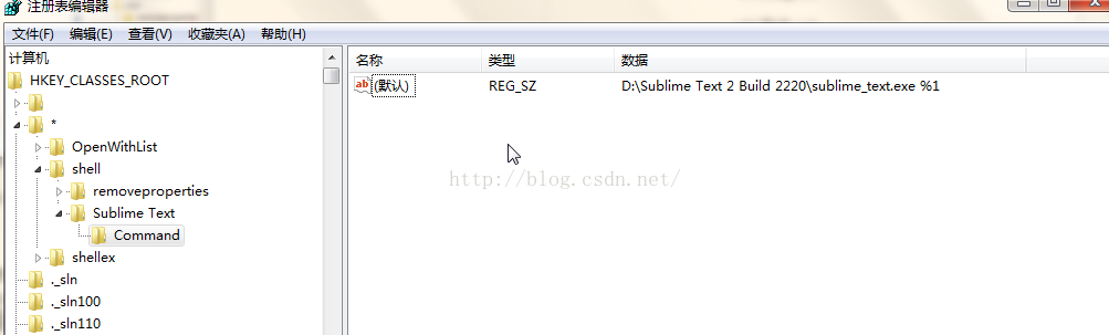 在shell下新建“Sublime Text”项,在右侧窗口的“默认”键值栏内输入“用Sublime Text打开”。项的名称和键值可以任意,最好是和程序关联起来。其中键值将显示在右键菜单中。